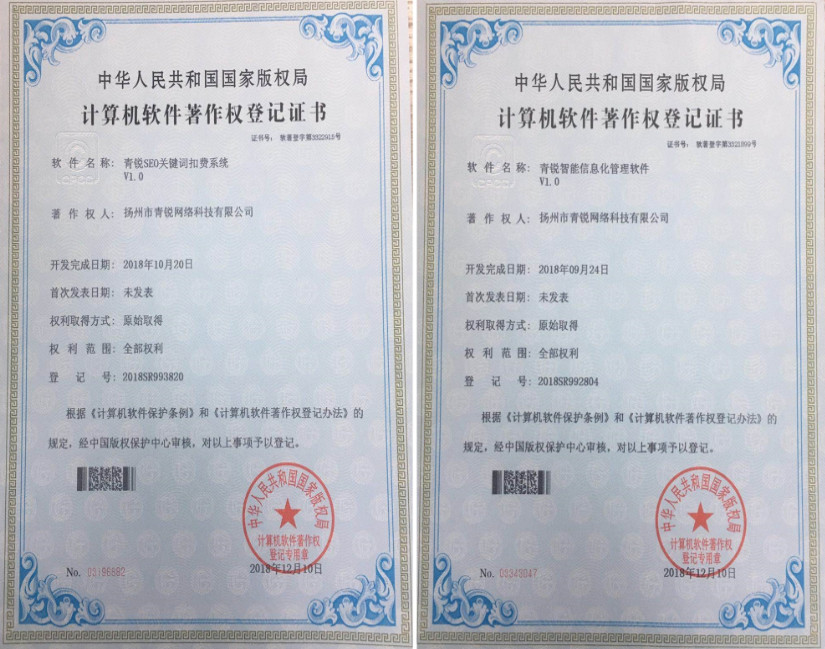 2019年01月02日熱烈祝賀揚州市青銳網絡科技有限公司取得7項軟件著作權根據《計算機軟件保護條例》和《計算機軟件著作權登記辦法》規定,經中國版權保護中心審核,揚州市青銳網絡科技有限公司近期取得7項計算機軟件著作權 它們分別...