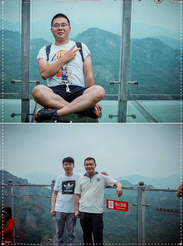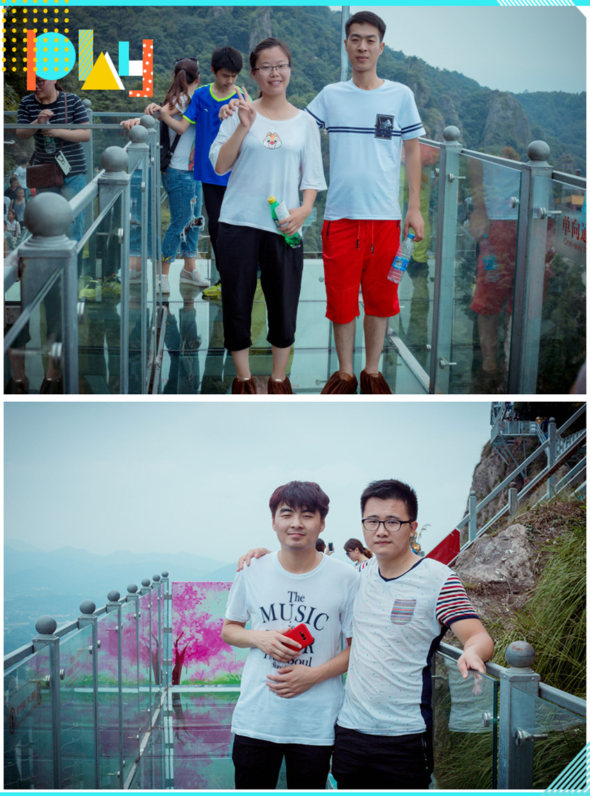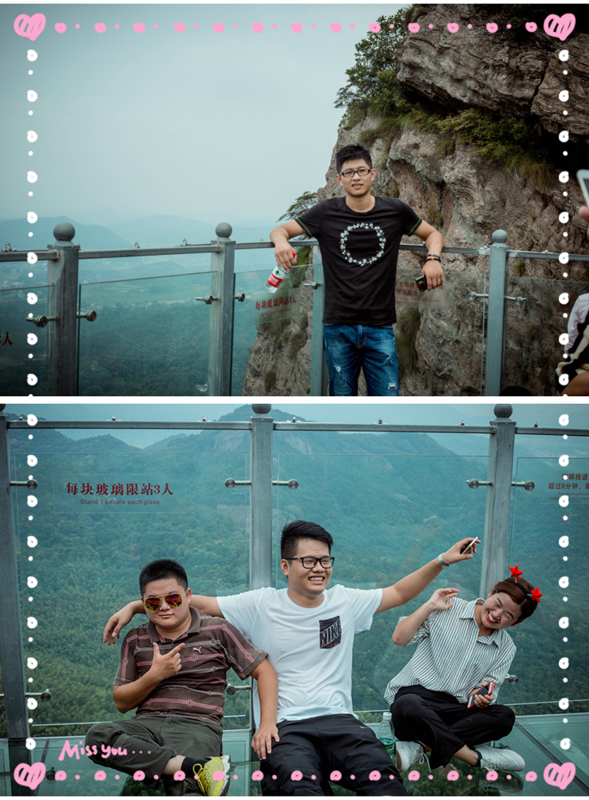 想要體驗玻璃棧道的驚險,我們首先要通過自己的努力爬上山頂,這是一個相互協作的過程,山路的崎嶇,對于久坐辦公室的我們來說是一個考驗,但我們的小伙伴是友愛的,不會落下一個,不會拋下一個,走不動的時候,總會有加油吶喊聲在耳側傳來。辛苦只是過程,結果總是美好的,當顫顫巍巍走到玻璃棧道入口時,我們又是那么的開心,因為我們終于得到了我們想要的結果。玻璃棧道上,小伙伴做著各種各樣的造型,證明自己來過,展示著自己的強大內心。